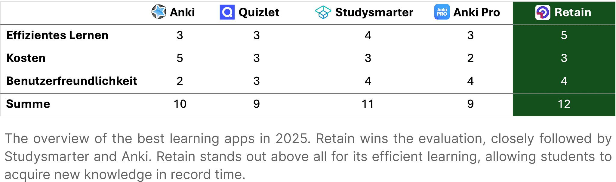 After a detailed comparison of the best free flashcard apps in 2025, Retain wins with a total score of 12 out of 15 points. Thanks to its combination of cutting-edge learning algorithms, an intuitive user interface, and flexible pricing options, Retain offers the best balance between efficiency, user experience, and cost.