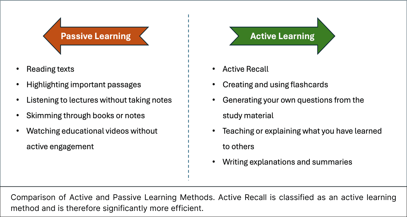 Comparison with Passive Learning Methods: Passive study methods—such as simply reading texts or highlighting key passages—require less cognitive effort and often lead to a false sense of understanding. Studies have shown that while these methods may give the illusion of knowledge in the short term, they are far less effective for long-term retention. In contrast, Active Recall challenges the brain to repeatedly retrieve learned material, thereby strengthening memory. This active engagement leads to deeper processing and a better understanding of the subject matter.
