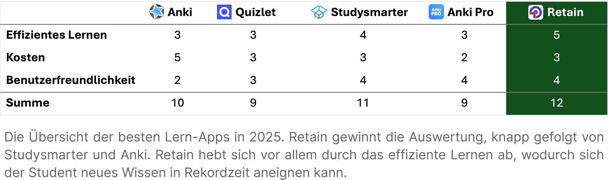 Nach einem detaillierten Vergleich der besten kostenlosen Lern-Apps im Jahr 2025 geht Retain mit insgesamt 12 von 15 Punkten als Gewinner hervor. Mit seiner Kombination aus modernsten Lernalgorithmen, einer intuitiven Benutzeroberfläche und flexiblen Preisoptionen bietet Retain die beste Balance zwischen Effizienz, Benutzerfreundlichkeit und Kosten. Während andere Apps wie Anki, Quizlet, Studysmarter und Notion ihre eigenen Stärken haben, überzeugt Retain besonders durch seine fortschrittlichen Funktionen und die Möglichkeit, Lernfortschritte präzise zu planen. Für Studenten, die ihre Lernzeit optimal nutzen möchten, ist Retain die ideale Wahl. Teste Retain noch heute!